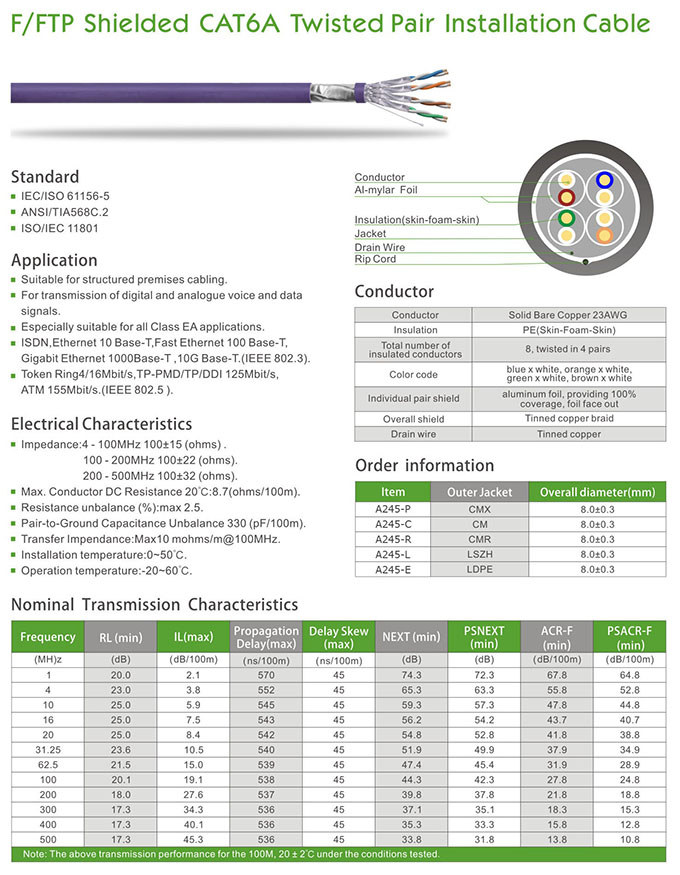 F/FTP Shielded CAT 6A Twisted Pair Installation Cable