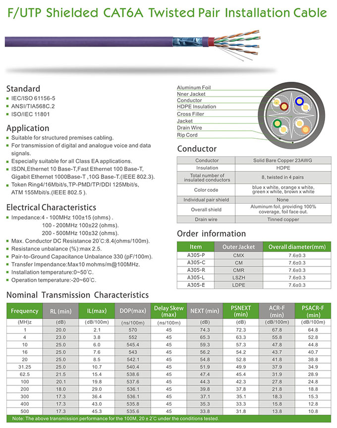F/UTP Shielded CAT 6A Twisted Pair Installation Cable
