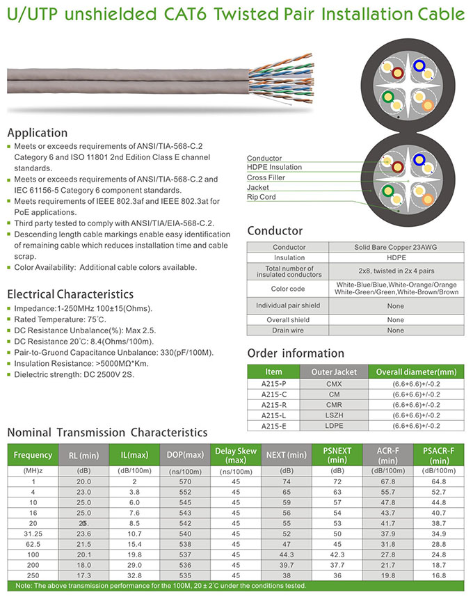 U/UTP Unshielded CAT 6 Twisted Pair Installation Cable