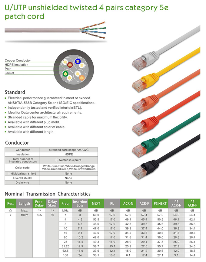U/UTP unshielded Twisted 4 Pairs category 5e patch cord