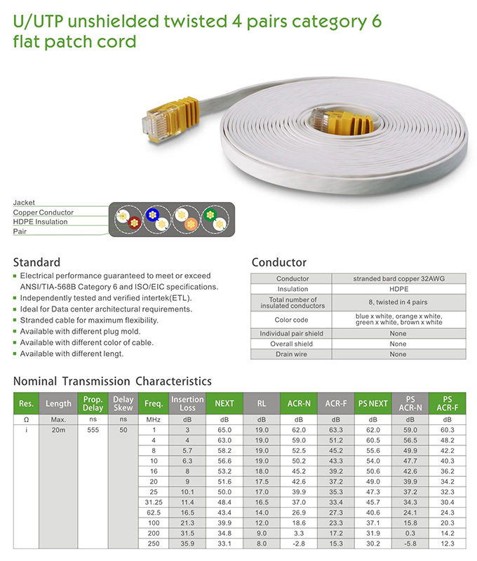 U/UTP unshielded Twisted 4 Pairs category 5e flat patch cord